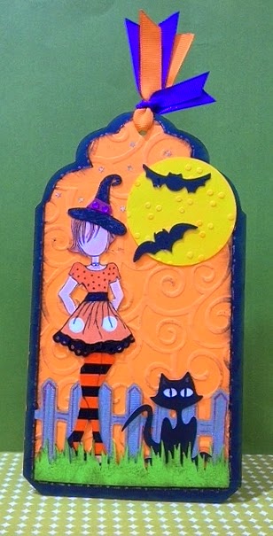 Muyyyy buenas noches amigas, encantada en presentarles mi proyecto para este Reto #22. El Tag que utilice mide 7 x 4 pulgadas, lo hice a doble relieve dejando la cartulina negra en la parte de abajo y la naranja arriba haciéndola resaltar con un repujado de Fantasía floral de mi Cuttlebug. Escogí para el disfraz de brujita a una Prima Doll la cual fue coloreada con dos de los tonos dispuestos en el reto y añadí para resaltar su falda un encaje en cartulina negra realizado con un punch, las medias las corte en un papel glasé brillante de colores naranja y negro a rayas y las demás figuras ( la grama, el gato, la reja, los murciélagos, la luna y el flamante sobrero de bruja) fueron cortadas en la Cricut.